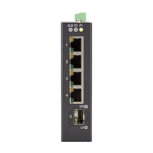 4個のポートは10-/100-/1000 Mbpsの銅製ポート (RJ-45) で、5個目のポートは柔軟なマルチレートSFPスロットになっています。このスロットに、あなたのニーズに合わせて100-FXまたは1000BaseSX/LX/LH SFP-モジュールを使用してください。