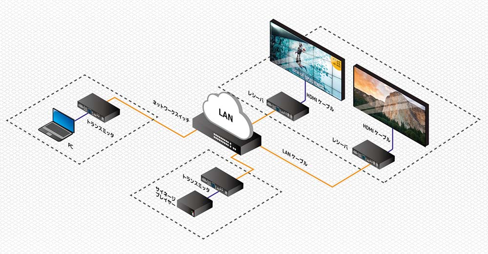 IP 配信技術は、トランスミッタとレシーバで TCP/IP ネットワーク(LAN や WAN など)を介して信号を延長します。コーデックと組み合わせて使用する場合は、IP ストリーマと呼ばれています。AV over IP 機器を検討するときは、小規模なストリーミング動画配信用の民生品ではなく、マルチキャストストリームが可能な業務用製品かを確認することをお勧めします。