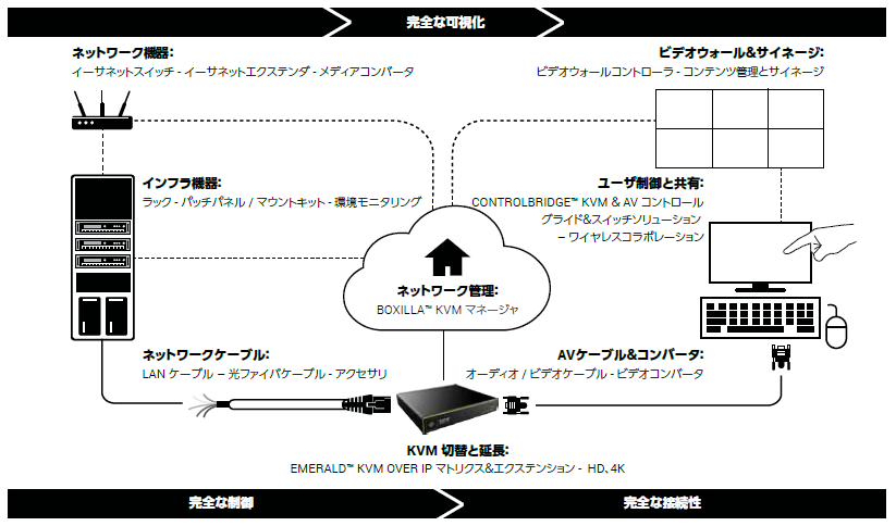 リモートコンピュータへのアクセス切替、延長、共有、ビデオと周辺機器の信号を複数のユーザステーションに配信します。