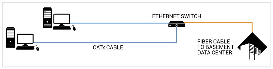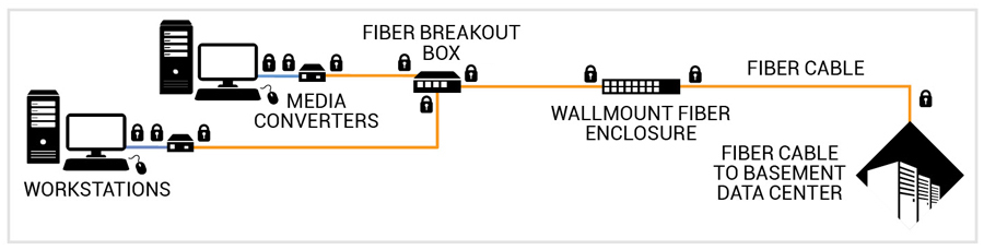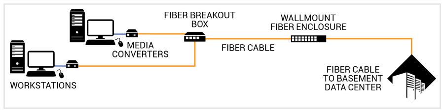 終端処理された認証済み光ファイバケーブルとメディアコンバータを利用して、光ファイバのメリットをフロアまで拡張し、セキュリティ、信頼性、帯域幅、総所有コストの改善を実現します。