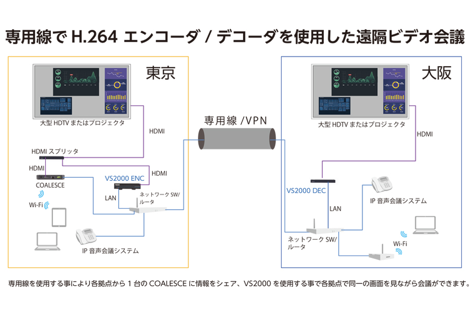 COALESCE と H.264 エンコーダ / デコーダの組み合わせで、支店間や海外オフィスと同一画面を共有、円滑な会議が実現します。