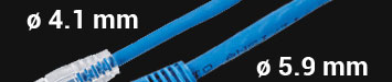 直径わずか 4.1mm の細径ケーブルは、通常ケーブル (24 AWG) のほぼ半分のサイズです。ケーブル径から面積を物理的に計算し比較したところ、従来のケーブルに比べて 50% 以上のスペースを節約できるようになりました。 長さと色は 7 種類から用意しています。