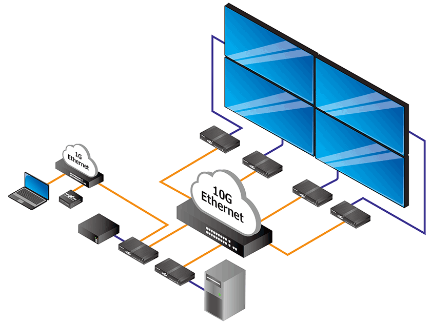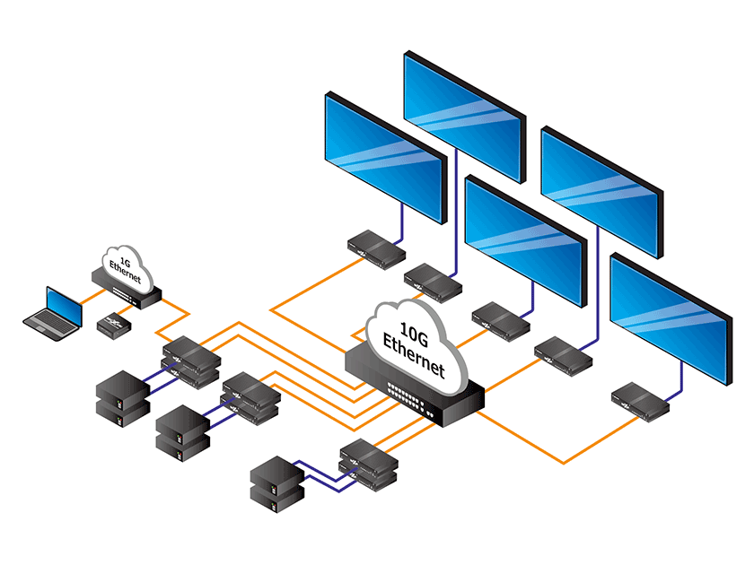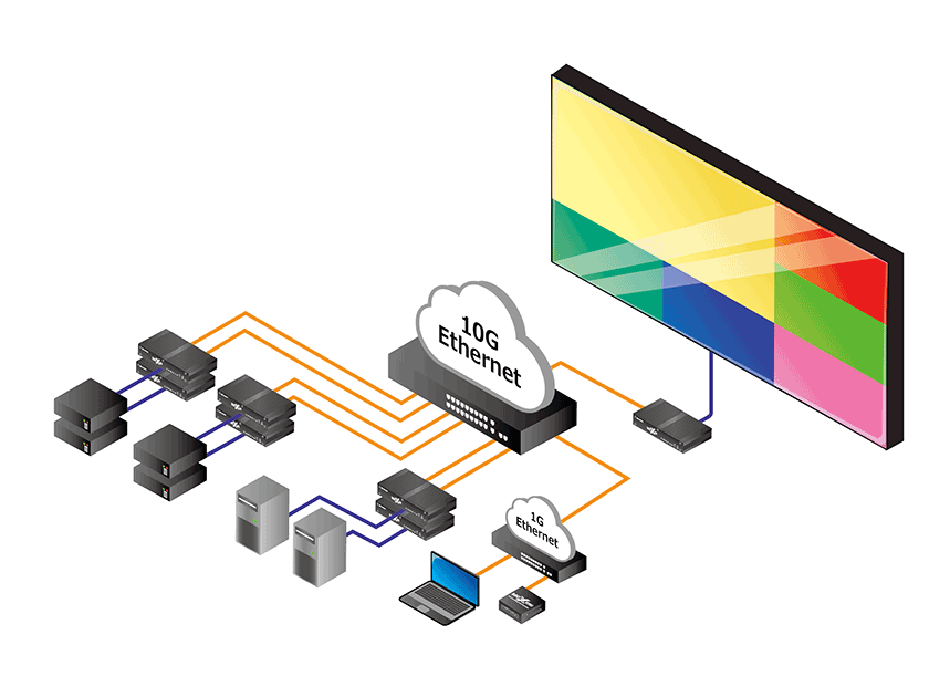 SDVoE と 10G イーサネットを活用し、映像・音声・制御データを同じ IP ネットワークでまとめて扱うことが可能になります。高度なチップセットテクノロジ、共通制御 API および相互運用性でシステムの柔軟な拡張性を実現、ネットワーク管理の時間とコストを大幅に削減します。