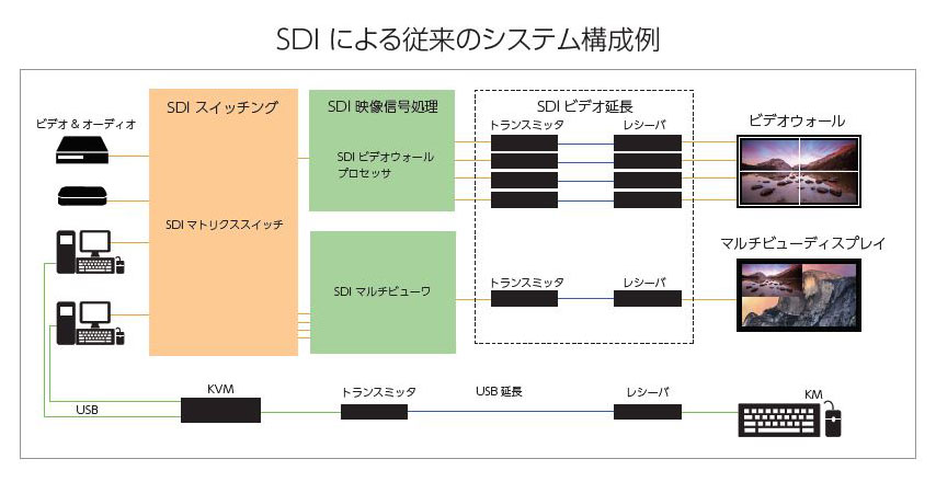 MCX で、従来のインフラ構成から、10Gb イーサネットを活用して、AV とデータペイロードを同じ IT ネットワーク上に存在させることで、それぞれマトリクススイッチ、マルチビューワやビデオウォールプロセッサなど専用の機器を必要とする構成から、MCX とネットワークスイッチだけのシンプルな構成に変更できます。将来的に映像ソースやモニタが増えても MCX の追加だけで、柔軟に拡張、コストも削減できます。
