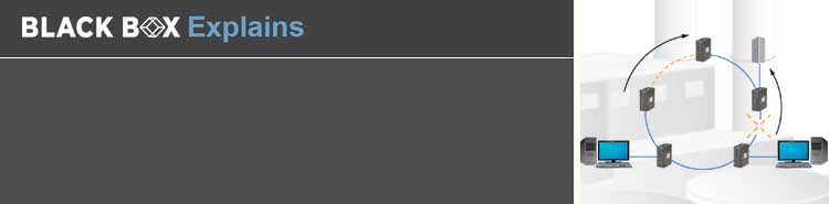 従来のリングトポロジでは、リング内の 1 つの機器に障害が起きると、ネットワーク全体に影響が出ていました。たとえば、ネットワーク上の複数のカメラから送られてくるすべてのビデオフィードが一気に消失する可能性もありました。この問題に対処するため、Black Box を含む複数の企業において、独自のリングトポロジが開発されました。リングの 2 つの方向にデータを流すことで、レジリエンス(耐障害性)とフェイルオーバ時間を改善したのです。この耐障害リングトポロジを産業用イーサネットスイッチと組み合わせると、15 ~ 30 ミリ秒以内にネットワークを復旧できます。これは、ビデオフィードを 1 フレームも落とすことのない速度です。