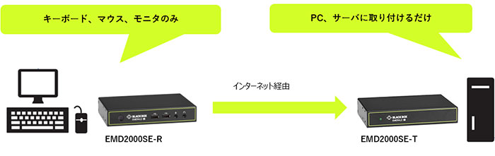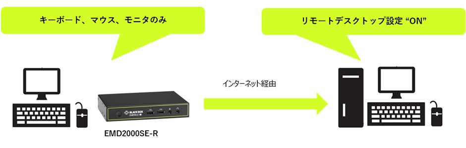 Black Box 本社では、研究開発チームのメンバーが自宅で仕事をしながらも、新製品のシステムテストを可能にするため、Emerald KVM システムを使い、リモートで VPN から WAN を経由し内部サーバとデバイスを制御しています。具体的には、研究開発スタッフが Emerald® レシーバと Windows リモートアクセス ソフトウェアを使ってリモート接続しています。これにより、開発チームとシステムテストチームは、ターゲットサーバと接続されたデバイスが完全に制御可能になりました。