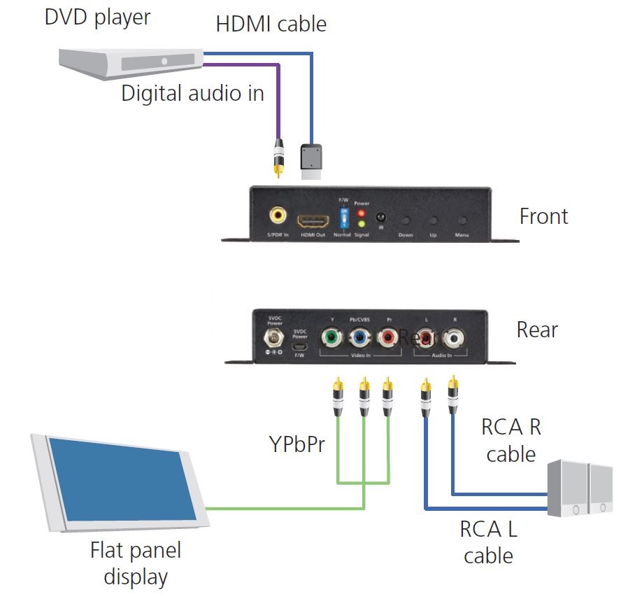 HDMI コンバータは、デジタル HDMI を、アナログ VGA、SDI、コンポーネントビデオ(デジタルオーディオやアナログステレオオーディオ付き)(またはその逆)に変換します。従来の非デジタル機器をデジタル HDMI や DVI の機器に接続するための、費用対効果の高いソリューションです。 デジタル HDMI からアナログステレオオーディオや SPDIF デジタルオーディオ付きアナログコンポーネント / コンポジットビデオに瞬時に変換する HDMI コンバータ / スケーラを使用すると、旧式テレビなどのアナログビデオレシーバを DVD プレーヤやビデオゲーム機などの HDMI ソースに簡単に接続できます。