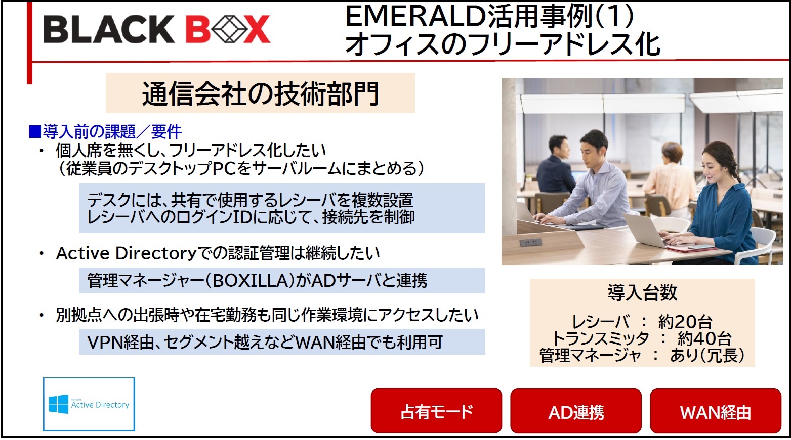 2-1. オフィスのフリーアドレス化 右上のフォームを送信して、本資料のダウンロードに進んでください。➡ IPKVM EMERALDEMERALDは、既存または専用 IP ネットワークを介して、ピクセル パーフェクトな HD / 4K ビデオを提供する KVM システムです。 |