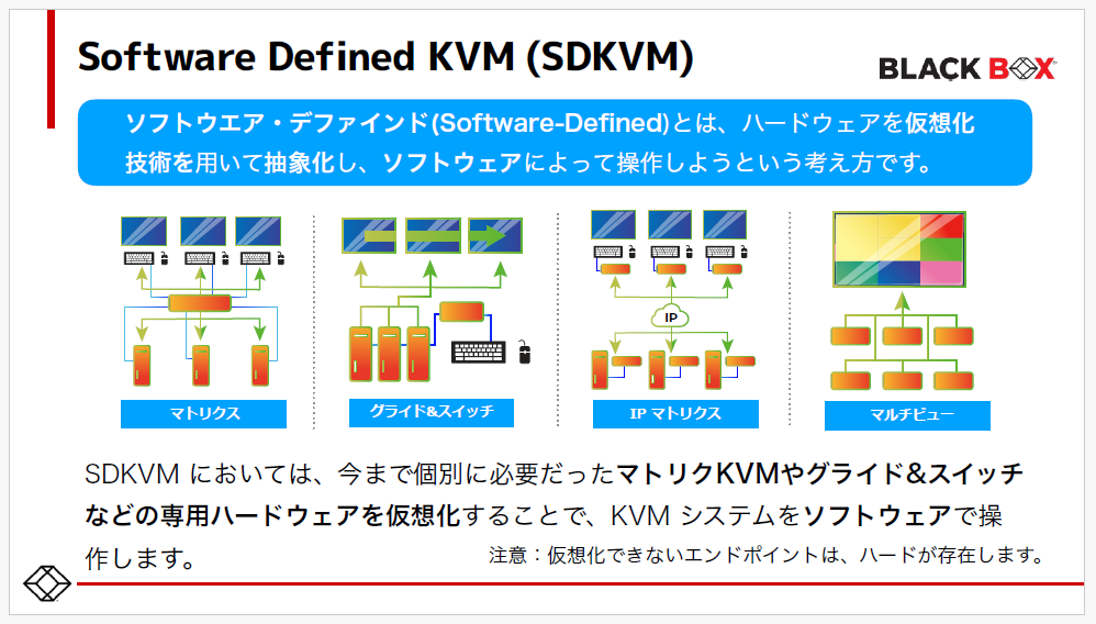EMERALDは、既存または専用 IP ネットワークを介して、ピクセル パーフェクトな HD / 4K ビデオを提供する KVM システムです。どこからでも無制限の数のサーバ、PC、仮想マシンにアクセスして管理し、専用 KVM ネットワークやインターネット経由でもハードウェアやライセンスなどのリソースを共有することができます。