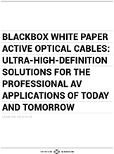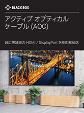 超高帯域幅(UHD)ビデオが拡大し続けているなか、プロ AV 製品を利用する環境では、手頃な価格で長距離伝送できるソリューションが求められています。この条件を適える Black Box のアクティブ オプティカル ケーブル(AOC)は、敷設が容易で、信頼性も高いオールインワン ソリューションです。コントロールルーム、デジタルサイネージ、医療現場など、UHD ビデオの長距離伝送が必要な業務 AV 環境でご利用いただけます。